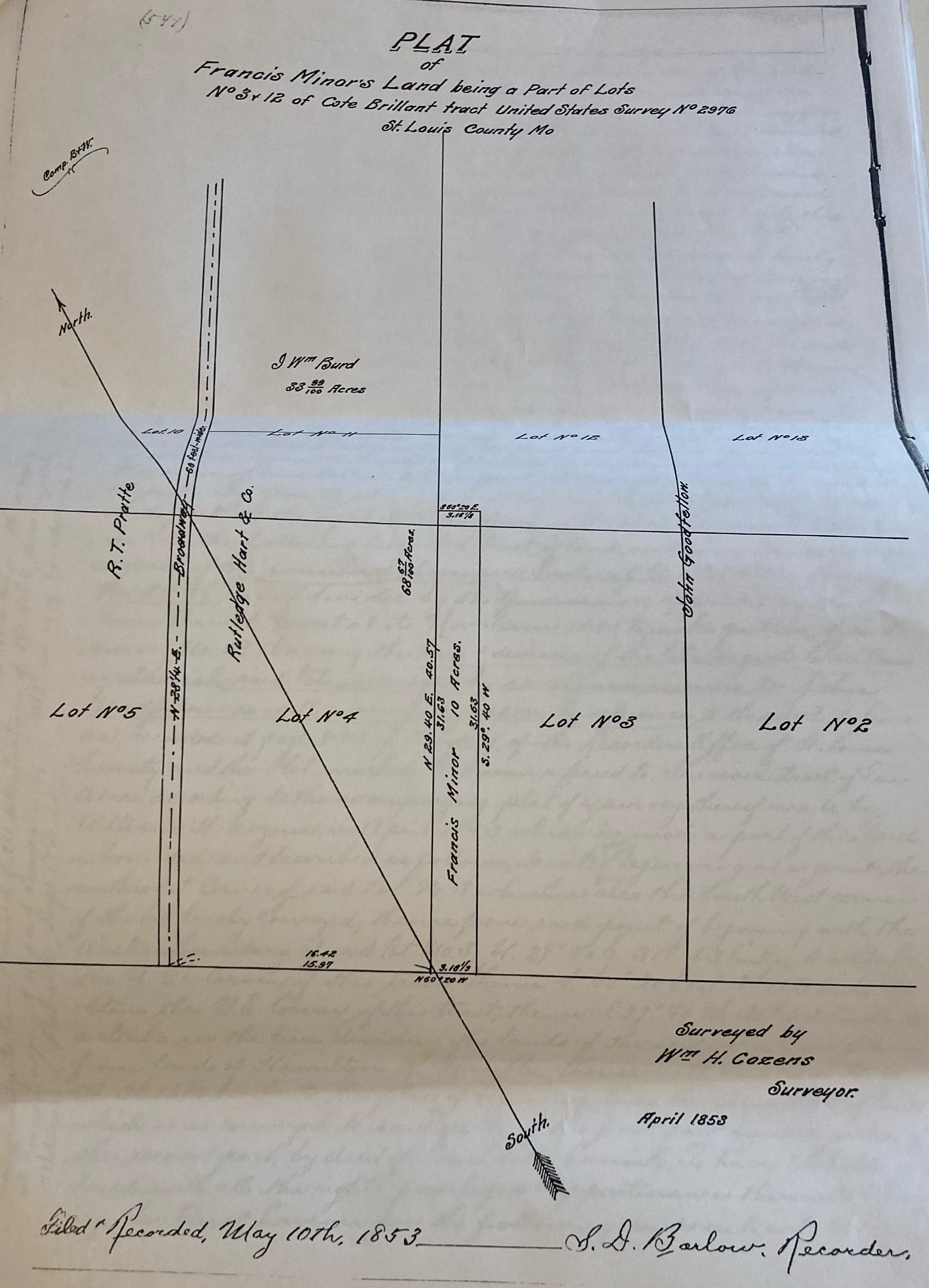 We know that Minoria was part of Lots 3 and 12 in the Cote Brillante tract (U.S. Survey No. 2976 conducted in April 1853). The deed of sale and survey plat (pictured below) give its coordinates as: “beginning at a point the southwest corner of lot 3 with the western boundary N29°40E. 31.63 links to the northwest corner of this tract. Thence S60° 20E 3.16 1/3 links to a stone the northeast corner of this tract. Thence S29°40W 31.63 links to a stake in the line dividing the lands of John Goodfellow from the lands of Hamilton R. Gamble. Thence with said line N60.20’W 3.16 1/3 links to the place of the beginning.”